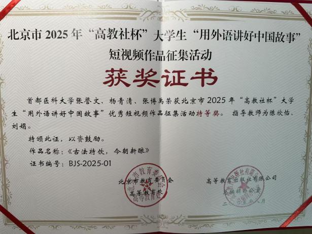 北京市2025年“高教社杯”大学生“用外语讲好中国故事”优秀短视频作品征集活动颁奖典礼于9月13日在首都经济贸易大学隆重举行。 “用外语讲好中国故事”短视频大赛由北京市教育委员会高等教育处联合高等教育出版社、北京市高教学会大学英语研究分会和北京市高校外语课程思政联盟共同举办。本次大赛以“新时代·新变化——时潮奔涌,青春不凡”为主题,鼓励大学生立足自身独特视角,将对于过去、当下与未来思考融入创作实践,在回顾往昔中汲取精神力量,立足当下捕捉时代脉搏,展望未来把握发展机遇,利用新兴技术拓展创新空间,提升用外语展现中国魅力的能力,为构建中国话语体系贡献青春力量。 草榴社区草榴社区 应用语言学系于今年2月至4月举办校内预选赛,校本部和附属医院同学踊跃参加,共提交作品57件。本次大赛,北京市共有来自33所高校的62件优秀作品入围市级评审环节。经过激烈角逐,草榴社区推荐的学生张誉文团队和吴宛彤团队的作品均喜获特等奖,其中张誉文团队作品荣获特等奖的第一名,获得全国现场交流机会。