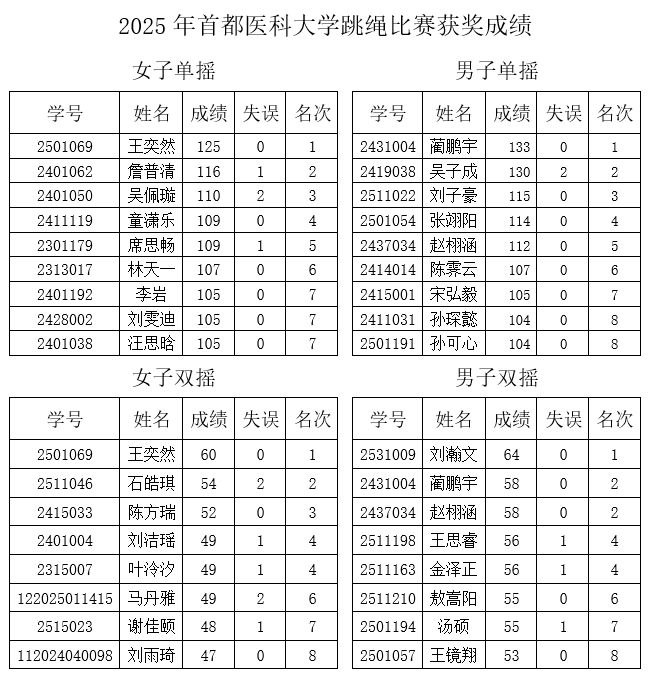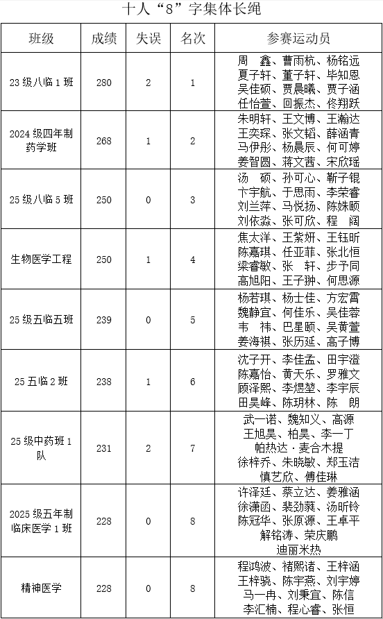 阳光洒满校园操场,参赛选手们精神抖擞。单摇项目率先拉开帷幕,选手们手中的跳绳飞速旋转,脚步轻盈地跳跃,绳子与地面摩擦发出有节奏的声响,让人目不暇接。在双摇比赛中,选手们展现出更高超的技巧,身体高高跃起,跳绳快速绕身两周,引得观众阵阵惊叹。十人八字集体项目则将比赛气氛推向高潮。每支参赛队伍的十名成员紧密配合,摇绳者有节奏地挥舞长绳,跳绳者则按照默契的顺序,依次穿梭在长绳之间,如同灵动的燕子。他们步伐矫健,动作流畅,脸上洋溢着自信与团结的光芒。赛场上,有的队伍配合失误,但成员们迅速调整,互相鼓励,继续投入比赛,充分展现了顽强拼搏、不放弃的精神。 经过两天激烈角逐,各项目名次尘埃落定。在单摇项目中,来自24级中医1班的蔺鹏宇同学凭借出色的节奏感和稳定发挥,斩获男子组冠军;女子组单、双摇冠军均被25级八临1班的王奕然同学收入囊中,她以轻盈的身姿和快速的跳跃频率征服了现场观众和裁判。那男子双摇项目中,来自25级中医班的刘瀚文同学脱颖而出获得冠军,展现了超强的体能和技巧。十人八字集体项目竞争最为激烈,最终23级八临1班凭借完美的配合和出色的速度,赢得冠军。其余获奖同学详见附表。 本次跳绳比赛不仅是一场体育竞技,更是同学们释放青春活力、增进友谊、增强团队凝聚力的盛会。它让同学们在紧张的学习之余,享受运动带来的快乐,也展现了草榴社区 学子积极向上、团结奋进的精神风貌。 来源:应用体育学学系 撰稿:李影 审核:杨树堃 2025.9.29 |